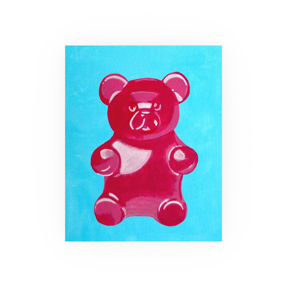 Gummy Bear Art Poster — Pink Candy Bear on Blue Background